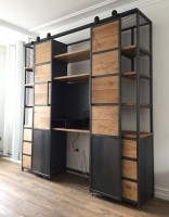 Это напольная или настенная модель, выполненная из толстых грубых досок из дерева и в сочетании с основами из металлических направляющих или даже из труб. От нас любой современный дизайн, в том числе и с использованием стекла. Тонировка и брашировка.